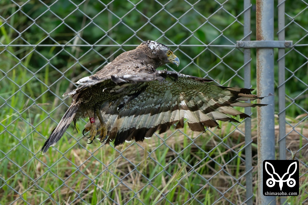 識別用に右足には赤に「4」が刻印された足環が装着されています。カンムリワシ保護活動の貴重なデータとなるので、発見した際はお知らせください。