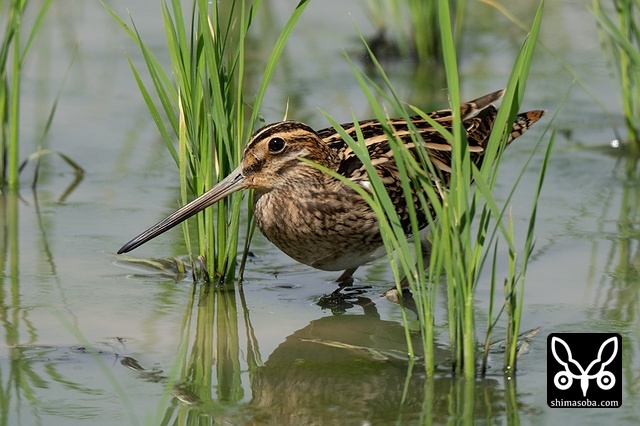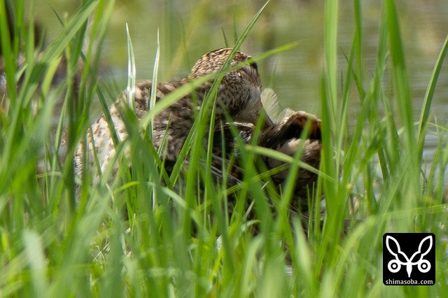数十羽のジシギを見続けて、やっと絞り出したハリオシギ。チュウジシギ10羽程度の群れを見ていると草むらの中にジシギが登場。典型的なハリオシギの幼鳥でしたので尾羽をゲットすべく双眼鏡で追っていると意外と早く水浴びをしてくれました。^^