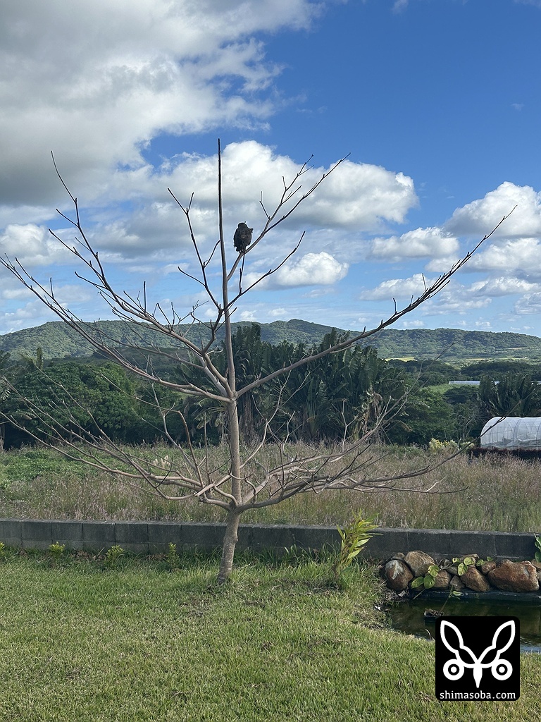 庭に現れたカンムリワシ。ビオトープのカエルが気になるようです。12月はヤエヤマアオガエルの繁殖シーズンのピークなので昼間でも鳴いています。